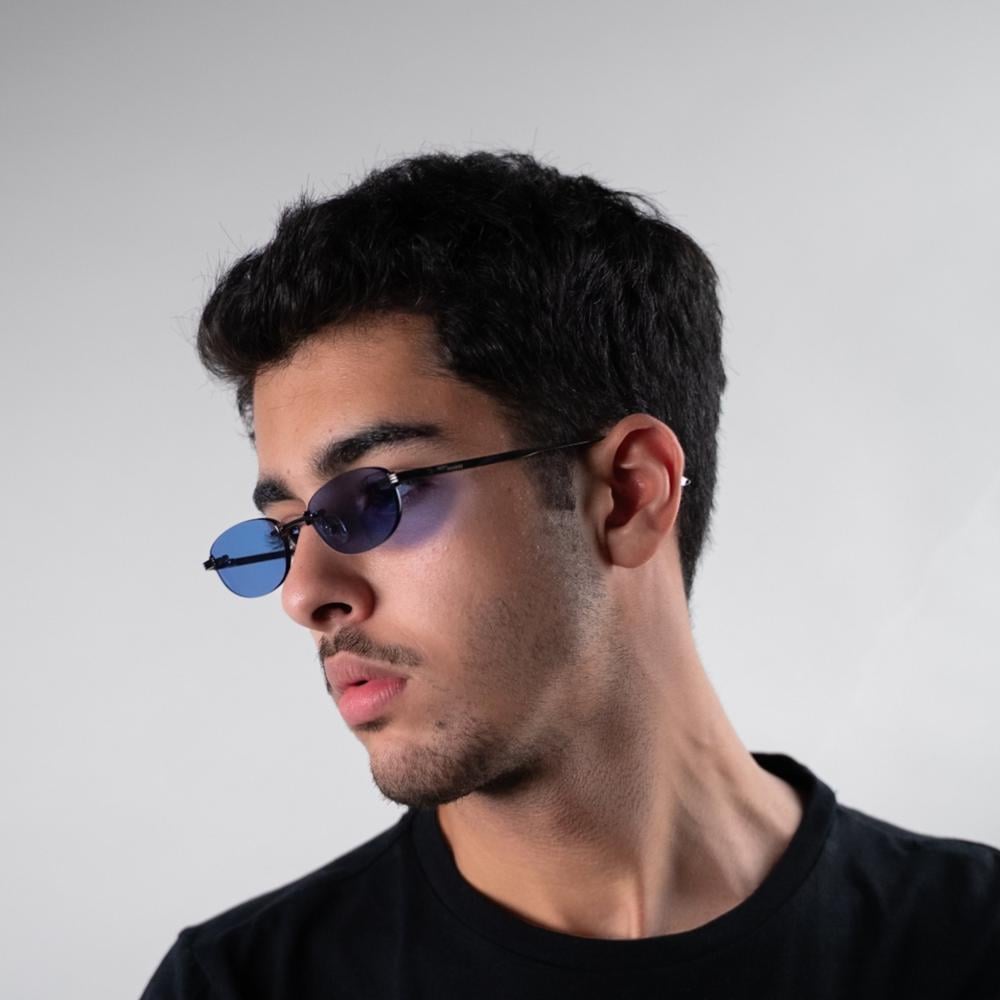 تتميز بعدسات باللون الأزرق العميق تمنحها طابعاً فريداً ولافتاً، مع إطار معدني خفيف يضيف لمسة أنيقة وانسيابية مريحة عند الارتداء.